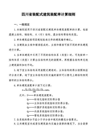 要點:《四川省裝配式建筑裝配率計算細則(試行)》實施以來,對全省裝配式建筑裝配率計算起到了積極的指導和規范作用。為進一步推動我省裝配式建筑的發展,規范裝配率計算,提升標準化建設水平,推進系統集成技術發展應用,我廳組織相關單位進行了修訂,并經專家審查通過,形成了《四川省裝配式建筑裝配率計算細則》,現予印發,自 2020 年 10 月 1 日起實施。